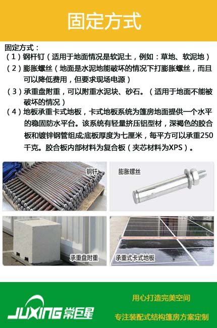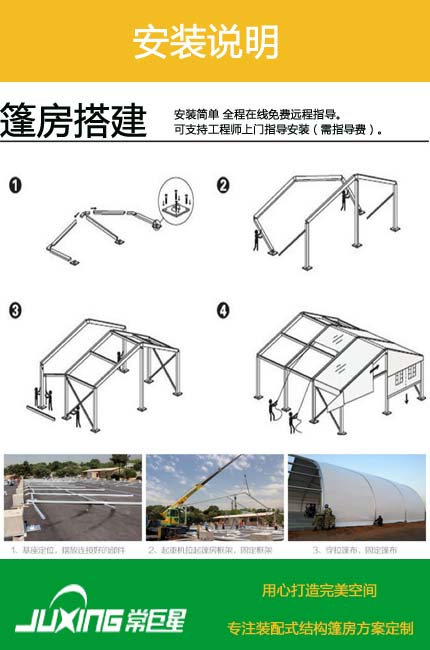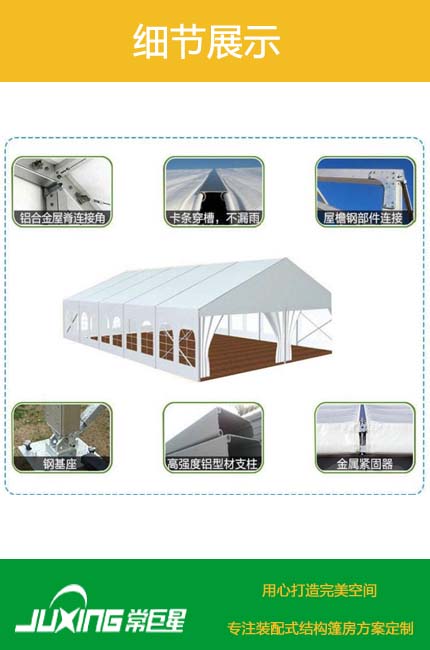 常巨星裝配式篷房公司是一家篷房研發(fā)、生產(chǎn)、銷售、租賃于一體的綜合性篷房公司。巨星公司秉著誠信經(jīng)營、客戶至上的經(jīng)驗理念服務(wù)客戶。本公司產(chǎn)品外觀簡潔大方,內(nèi)無支柱,百分百利用空間??蛇x配設(shè)施,可加照明,排水,防撞,地臺,空調(diào),發(fā)光燈箱,等系統(tǒng)。現(xiàn)有篷房主體框架為中空鋁合金結(jié)構(gòu),連接部位為采用國家焊接鋼結(jié)構(gòu),可調(diào)節(jié)式基座可彌補場地的不平,篷房采用PVC篷布,該篷布具有不拉伸的良好性能,不透光,采用高頻焊接技術(shù),篷房抗風(fēng)能力達(dá)到80-100公里/小時。具有體積小,儲存方便,拆裝靈活快捷易運輸?shù)忍攸c,單位組合式結(jié)構(gòu),可根據(jù)場地的大小自由增加,對搭建場地?zé)o特殊要求,一般場地如草地、大理石地、瀝青地面、水泥地均可。篷房內(nèi)無支柱,場地空間得到利用